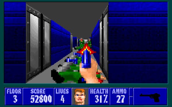 Ten tytuł to istna klasyka FPS, w którą grał niemal każdy. Choć dziś wygląda tak, że nie chce się wierzyć, że ktokolwiek poświęcał czas na tę produkcję, wtedy stanowiła istny hit, który pochłaniał naprawdę długie godziny. Gracz wcielał się w rolę alianckiego komandosa, który został wysłany na specjalne misje do nazistowskiego zamku Hollehammer, w którym prowadzone były eksperymenty mające na celu stworzenie broni doskonałej – superżołnierza. Zadanie było proste: wystrzelać wszystko, co spotkamy na drodze, a byli to nazistowscy żołnierze w różnej randze. W trakcie rozgrywki penetrowało się tajne przejścia pełne złotych pucharów i innych skarbów, zapewne skradzionych państwom podbitym. Największą frajdę sprawiały jednak walki z bossami, które stanowiły wyniki prowadzonych w zamku prac, ucieleśnienie wunderwaffe. W większości były to olbrzymy z twarzą Hitlera, umieszczone w potężnych pancerzach wyposażonych w śmiercionośną broń. Coś na wzór dzisiejszych mechów. Wolfenstein 3d zachwycał pod każdym względem, rozgrywka była dynamiczna i ekscytująca, a sam tytuł stał się wzorem dla przyszłych FPS-ów. To, co dzieciakom w tamtym czasie przypadało jeszcze do gustu, to motyw obrazowania doznanych ran. Na ekranie, pod bronią znajdowała się miniaturka odzwierciedlająca twarz twardziela, prawdziwego komandosa na wzór Arnolda Schwarzenegger. Wraz z otrzymywaniem kolejnych postrzałów, facjata pokrywała się coraz większą ilością krwi. Wierzcie, w tamtych czasach robiło to wrażenie.