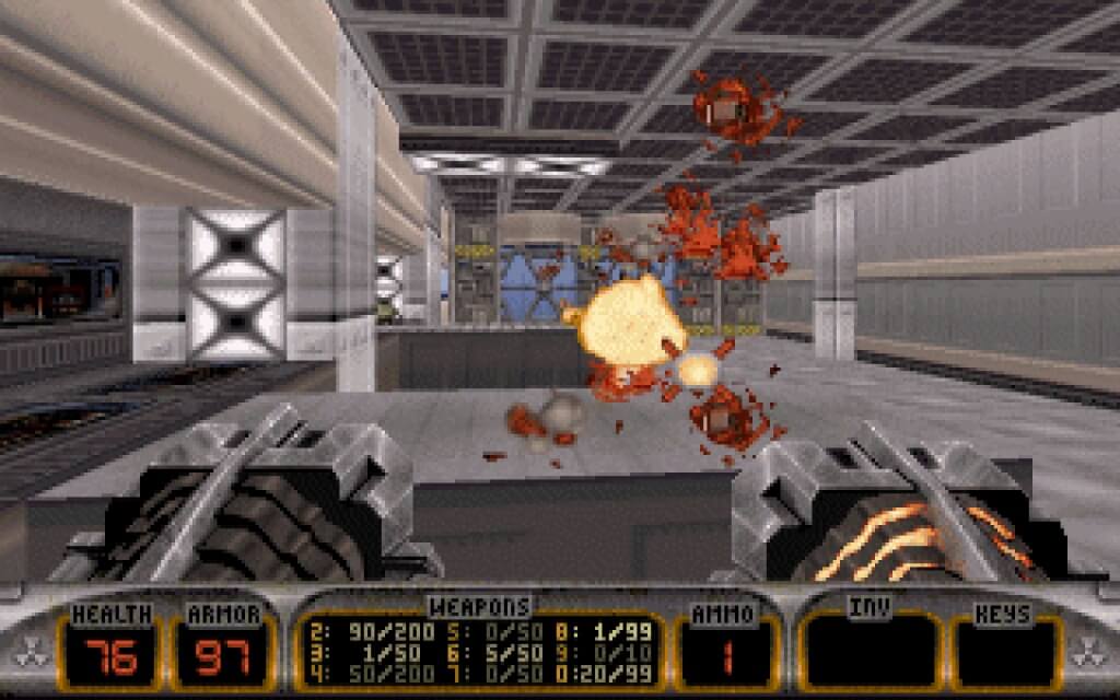 I wreszcie doszliśmy do największego hitu tamtej dekady. Powstały w 1996 roku Duke Nukem 3d był istnym krokiem w przyszłość. To kolejna gra, w którą trzeba było bawić się za plecami rodziców. Skłamałbym bowiem, gdybym napisał, że była przeznaczona dla dzieci. Wulgaryzmy, nagie tancerki i knajpy dla dorosłych dostarczały wiele zabawy, ale na pewno nie spodobałyby się rodzicom. Duke to jeden z największych twardzieli w historii gier wideo. Ta odsłona była pierwszą, która przestała być platformówką i została pięknym, trójwymiarowym FPS-em. Główna fabuła toczy się w Los Angeles w XXI w. (choć do wyboru były także epizody, rozgrywające się np. w kosmosie), kiedy to Ameryka została najechana przez przybyszów z kosmosu, którzy infekowali ludzi zmieniając ich w krwiożercze potwory. Duke ma za zadanie stawić czoła nieproszonym gościom i… po prostu wybić wszystkich po kolei. Gra zachwycała grafiką, która była naprawdę maksimum tego, co można było w tamtych czasach osiągnąć. Najbardziej jednak podobało się żyjące otoczenie. Przedmioty zachowywały się jak w realnym życiu, przestały być jedynie sztucznymi bitmapami. Na ścianach można było włączać przełączniki światła, puszki przewracały się gdy do nich strzelaliśmy, kieliszki się tłukły, a w toalecie można było załatwić soją potrzebę, po czym spuścić wodę. Wszystko to sprawiało, że Duke był wręcz fenomenalną grą, żywą i bardzo szczegółową.